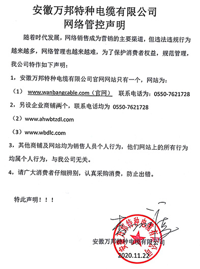鄭重聲明:安徽萬邦特種電纜有限公司官方網站為:www_wanbangcable_com.gaxgs.com,除此之外無任何子網站或合作網站,其余均為假冒偽劣。電話:0550-7621728 13485756353 地 址:安徽省天長市滁州高新技術產業開發區經四路29號